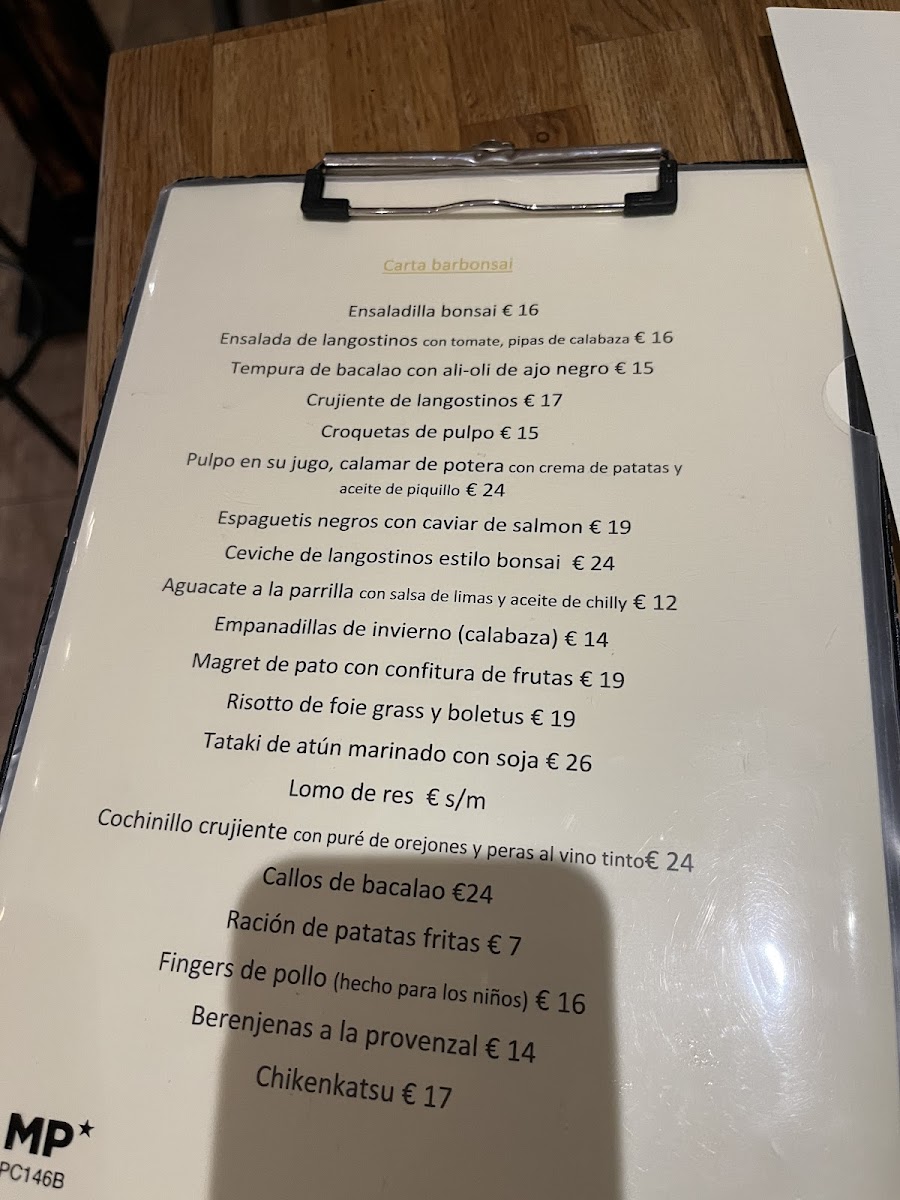 Bar Bonsai offers a distinctive menu that blends traditional Spanish flavors with modern culinary twists. Among the standout dishes is the Crujiente de langostinos, a crispy shrimp appetizer that promises a delightful crunch. Another notable option is the Tempura de bacalao con ali-oli de ajo negro, a tempura-style cod served with a rich black garlic aioli, providing a perfect balance of textures and flavors. For seafood lovers, the Pulpo en su jugo con calamar de potera offers a tender octopus paired with calamari in a flavorful broth, making it a must-try. The restaurant also presents a few indulgent pasta and rice options, such as the Espaguetis negros con caviar de salmón, where the black spaghetti is complemented by the luxurious touch of salmon roe, and the Risotto de foie-gras y boletus, a creamy and rich risotto infused with the deep flavors of foie gras and boletus mushrooms. Each dish is expertly crafted, and while the prices aren't specified here, the quality and creativity in the offerings make Bar Bonsai a place worth visiting for those looking for a memorable dining experience in Arganda del Rey.